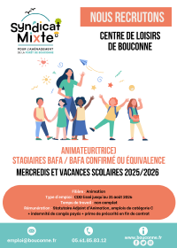Le Centre de loisirs de Bouconne recherche un(e) Animateur(trice) pour encadrer des enfants de 3 à 15 ans durant l’accueil de loisirs, les mercredis et vacances scolaires 2025-2026.